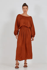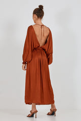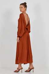 Open back featuring tie detail on back neck, gathered elastic waist, elastic sleeves and oversized design.