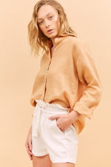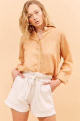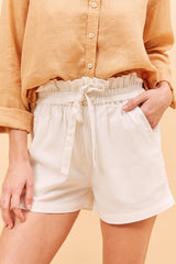 High-waist shorts featuring elastic ruched waist with wrap tie and side pockets.