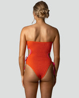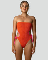 New to our Conscious Crinkle collection, The SEADREAM MAILLOT. A strapless style full piece, with a bound cutout feature on the left and bound cutout and tie on the right.