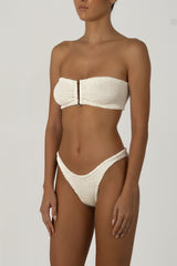 Two-piece FRIDA WHITE swimsuit by PARAMIDONNA. The one size model is designed to flatter sizes from XS to 2XL. The strapless bustier top features a stylish cut-out in the middle, accentuated by a metallic accessory, while the moderate cut, low-waisted bikini bottom ensures a comfortable fit. This swimsuit is perfect for achieving an even tan. FRIDA's adaptable design suits women of all bust sizes, ensuring a great fit every time.