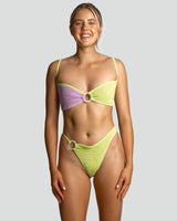 The PALM KINI is our new style dual shoulder strap kini top. The PALM KINI MULTI is two tone and features adjustable shoestring straps and a centre acetate hoop in colour to compliment the kini. This beautiful kini top can be worn in and out of the water to compliment your summer outfit.